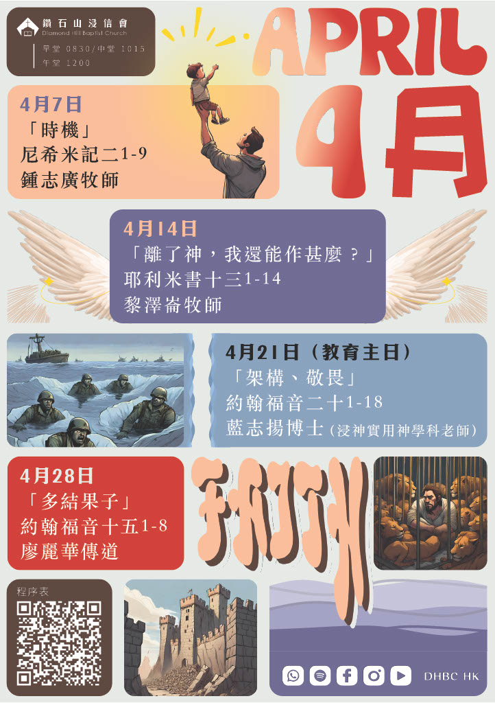 四月七日 講題: 時機 講員: 鍾志廣牧師 經文: 尼希米記二1-9 崇拜程序表 錄音 https://dhbc.hk/wp-content/uploads/Apr-07-鍾志廣牧師-時機-中.mp3 四月十四日 講題: 離了神,我還能作甚麼? 講員: 黎澤崙牧師 經文: 耶利米書十三1-14 崇拜程序表 錄音 https://dhbc.hk/wp-content/uploads/Apr-14-黎澤崙牧師-離了神,我還能作甚麼?-中.mp3 四月二十一日 教育主日 講題: 架構、敬畏 講員: 藍志揚博士 經文: 約翰福音二十1-18 崇拜程序表 錄音 https://dhbc.hk/wp-content/uploads/Apr-21-藍志揚博士-架構、敬畏-中.mp3 四月二十八日 講題: 多結果子 講員: 廖麗華傳道 經文: 約翰福音十五1-8 崇拜程序表 錄音 https://dhbc.hk/wp-content/uploads/Apr-28-廖麗華傳道-多結果子-午.mp3