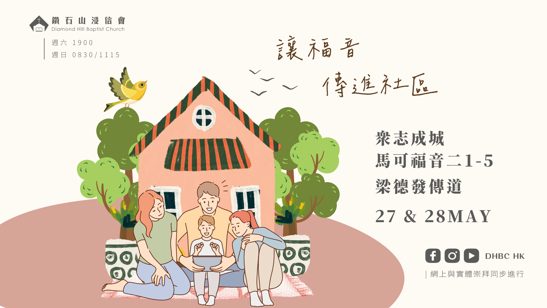 本週講員及題目 講題: 眾志成城 講員: 梁德發傳道 經文: 馬可福音二1-5 崇拜程序表講道錄音 晚堂 https://dhbc.hk/wp-content/uploads/May_27-梁德發傳道-眾志成城.mp3 主日 https://dhbc.hk/wp-content/uploads/May_28-梁德發傳道-眾志成城-午.mp3