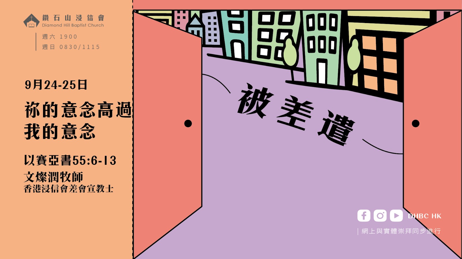本週講員及題目 講題: 祢的意念高過我的意念 講員: 文燦潤牧師(香港浸信會差會宣教士) 經文: 以賽亞書55:6-13 崇拜程序表講道錄音 晚堂 https://dhbc.hk/wp-content/uploads/Sep_24-文燦潤牧師-祢的意念高過我的意念.mp3 主日 https://dhbc.hk/wp-content/uploads/Sep_25-文燦潤牧師-祢的意念高過我的意念-午.mp3