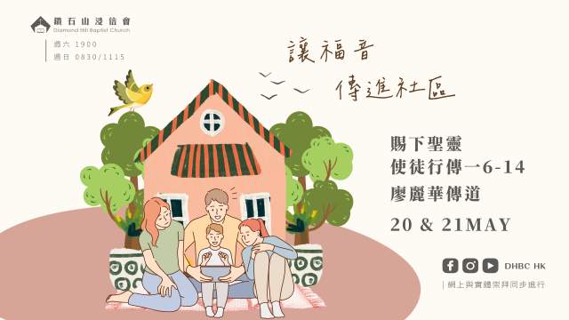 鑽浸崇拜 2023.05.20&21 每周程序表及講道錄音By admin2023 年 5 月 20 日本週講員及題目 講題: 賜下聖靈 講員: 廖麗華傳道 經文: 使徒行傳一6-14 講道錄音 晚堂 https…