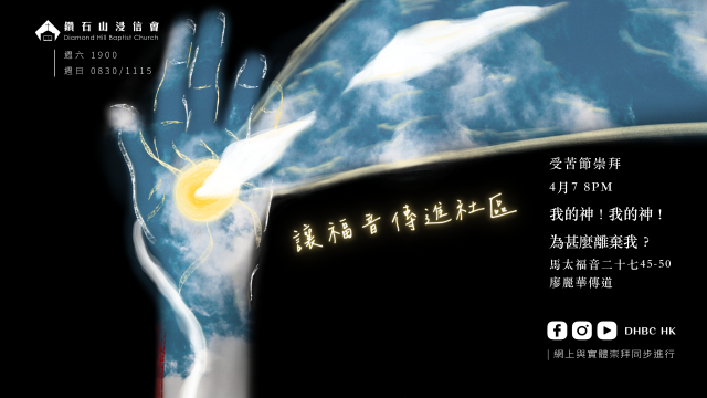 受苦節崇拜講員及題目 講題: 我的神!我的神!為甚麼離棄我? 講員: 廖麗華傳道 經文: 馬太福音二十七45-…