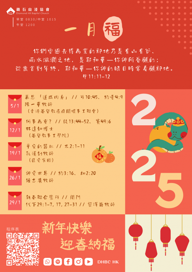 一月五日 講題: 再思「道成肉身」 講員: 陳一華牧師(香港基督教癌症關懷事工聯會) 經文: 馬可福音10:4…