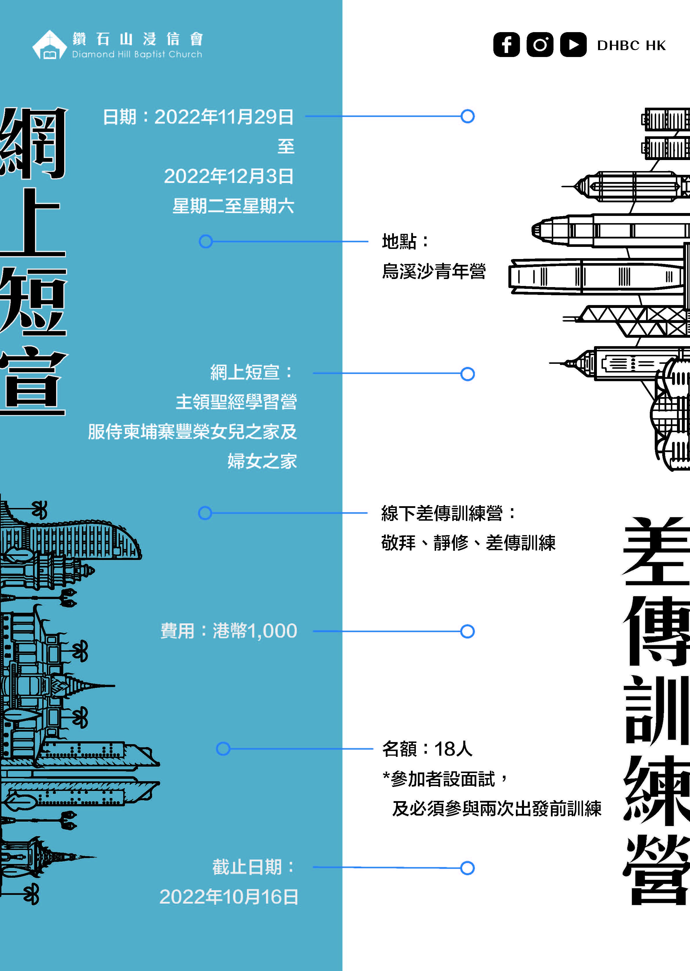 宣教部將於 11 月 29 日至 12 月 3 日舉辦網上短宣‧差傳訓練營,地點為烏溪沙青年營。服事對象為柬埔寨豐榮女兒之家及婦女之家,現誠邀弟兄姊妹一同參與,費用為港幣 1,000 元。本主日截止報名,詳情可與黃君灝弟兄或林兆熊弟兄聯絡。